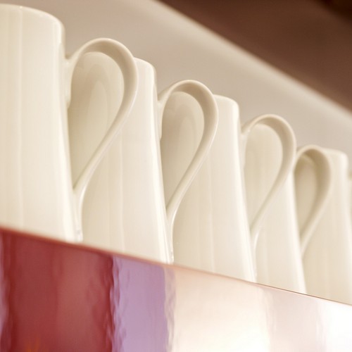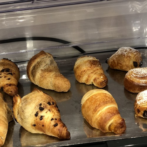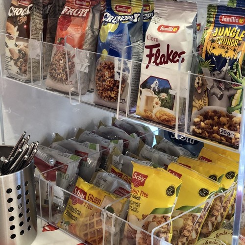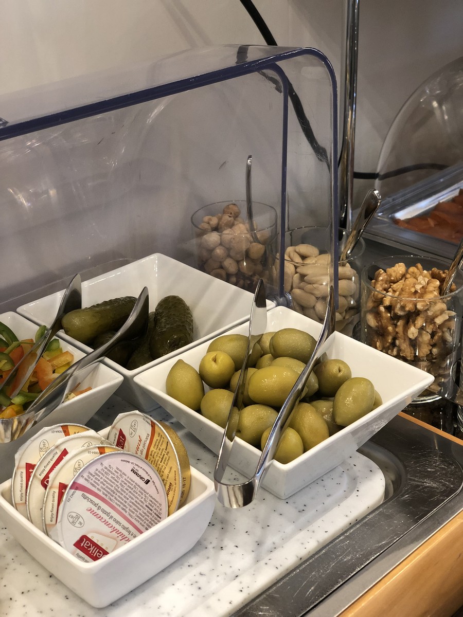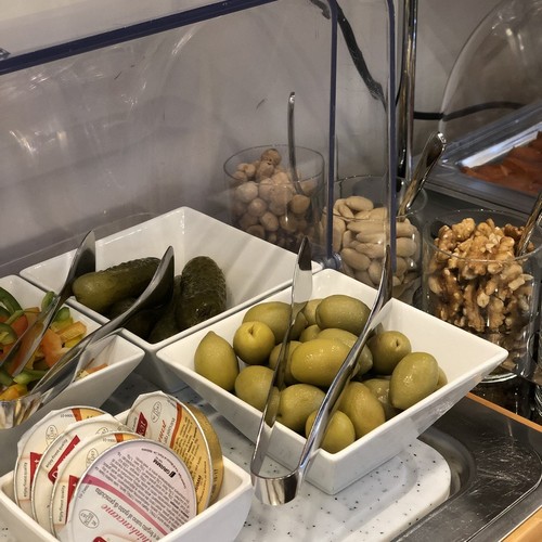 Frühstücksbuffet mit Einwegprodukten und teilweise am Tisch serviert.
